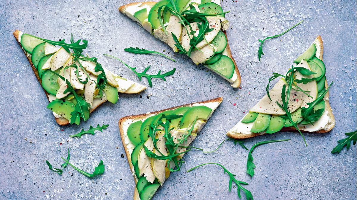 Краставиците се подреждат от едната страна, авокадото – от другата, а пилешкото се слага в средата. Върху всеки сандвич се поставят няколко листа рукола, поръсва се сол и черен пипер, прясно изцеден сок от лайм, и се сервира.