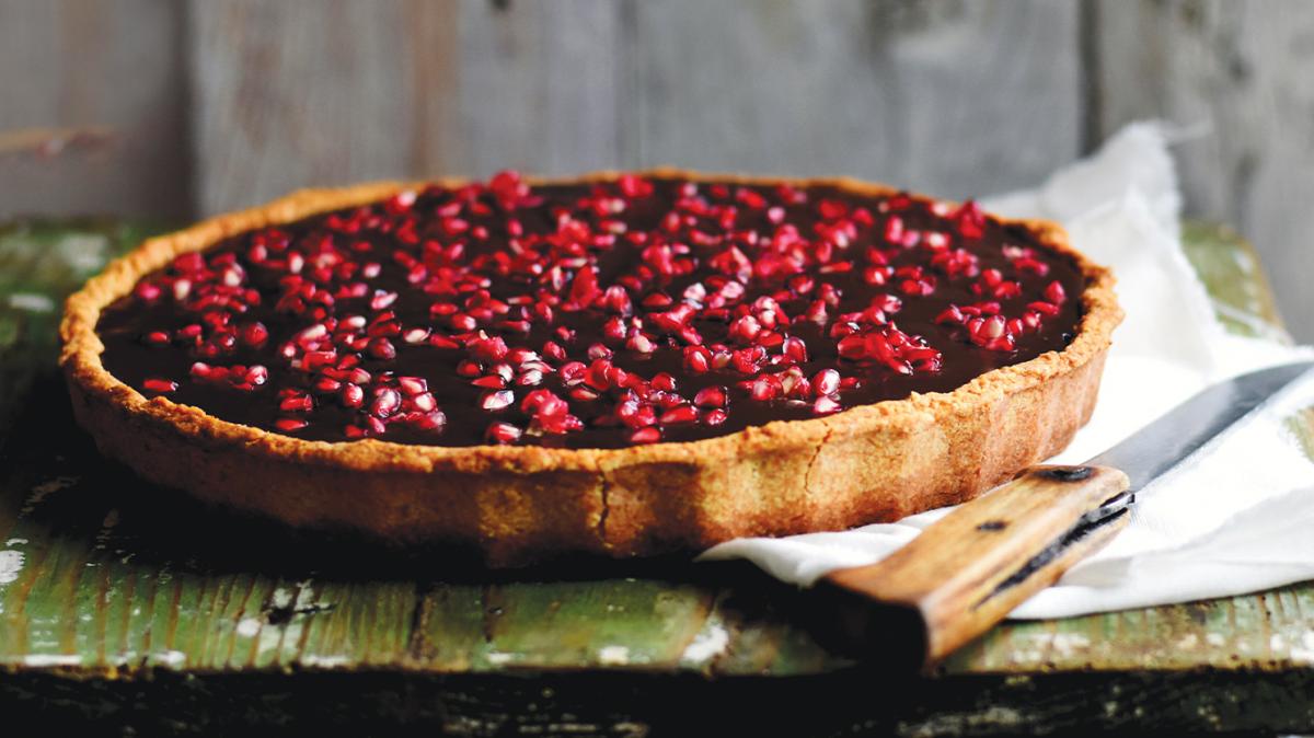 Сметаната се загрява и се сипва върху ситно нарязания шоколад. Оставя се на страна за 2 минути, след което се разбърква, докато шоколадът се разтопи. Тартът се полива с шоколадовата смес и се поръсва със зрънцата от нар. Десертът се оставя да се охлади.