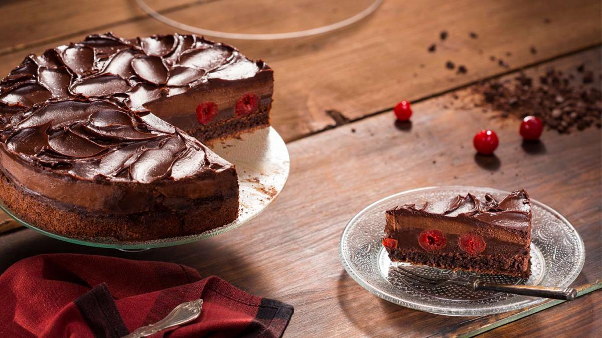 180 г шоколад (85% какао) се разтопява, охлажда се леко, смесва се с 250 мл от сметаната и се добавя към яйчената смес. Мусът се разпределя върху ганаша с череши и тортата отново се прибира в хладилник, за да стегне.
