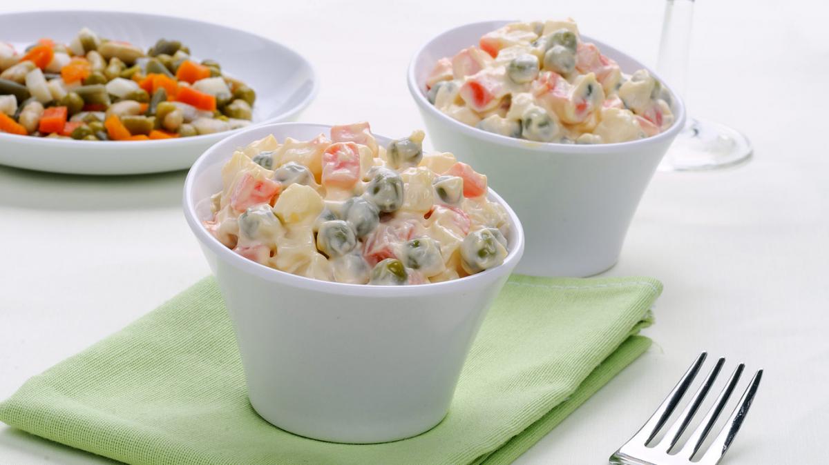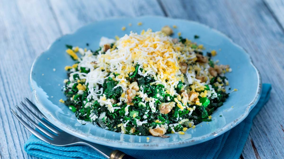 Салатата се разпределя в чинии, отгоре се настъргва сирене и се слага стръкче магданоз.