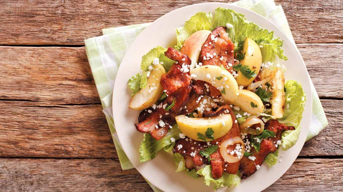Поставя се като основа, а върху нея се подреждат запеченият бекон и ябълките с шалота. Най-отгоре се поръсва с отцедено и натрошено козе сирене.