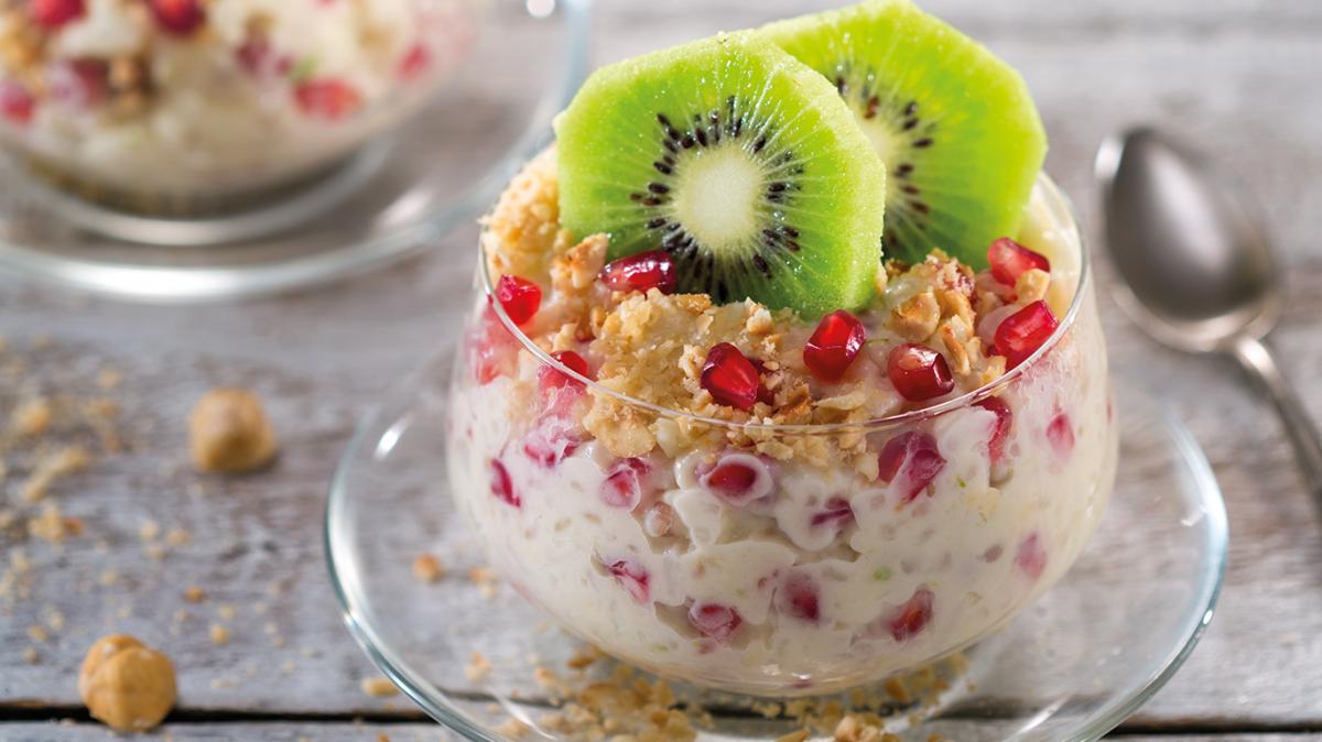 1accessibility.recipes.cookingstepВ касерола се загрява маслото, сипва се оризът, разбърква се и малко по малко се наливат 3 ч. ч. вода, докато се свари оризът. Дърпа се от огъня.2accessibility.recipes.cookingstepВ друг съд се кипва сметаната. Жълтъците се разбиват със захарта и към тях се налива сметаната, постепенно и при постоянно бъркане.3accessibility.recipes.cookingstepСместа се вари на слаб огън, докато стане на крем. Дърпа се от огъня, оризът се сипва в крема и се разбърква4accessibility.recipes.cookingstepДобавят се зрънцата от нара, настърганата кора от лайм и отново се разбърква.5accessibility.recipes.cookingstepКивито се обелва и се нарязва на тънки шайби.6accessibility.recipes.cookingstepОризът се сипва в чаша, слагат се парченца киви и се поръсва с натрошени лешници.