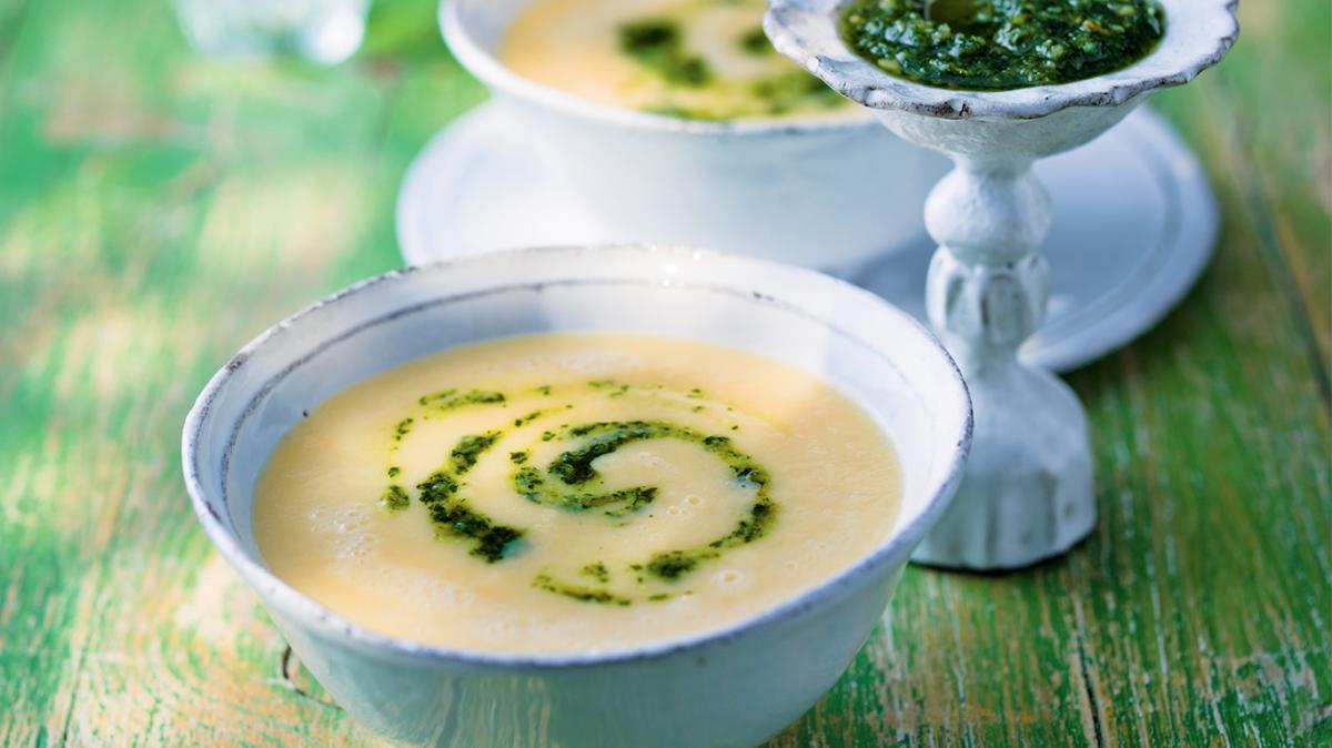 Всички съставки за пестото се слагат в блендер и се разбиват до хомогенизиране. Супата се сервира с песто.