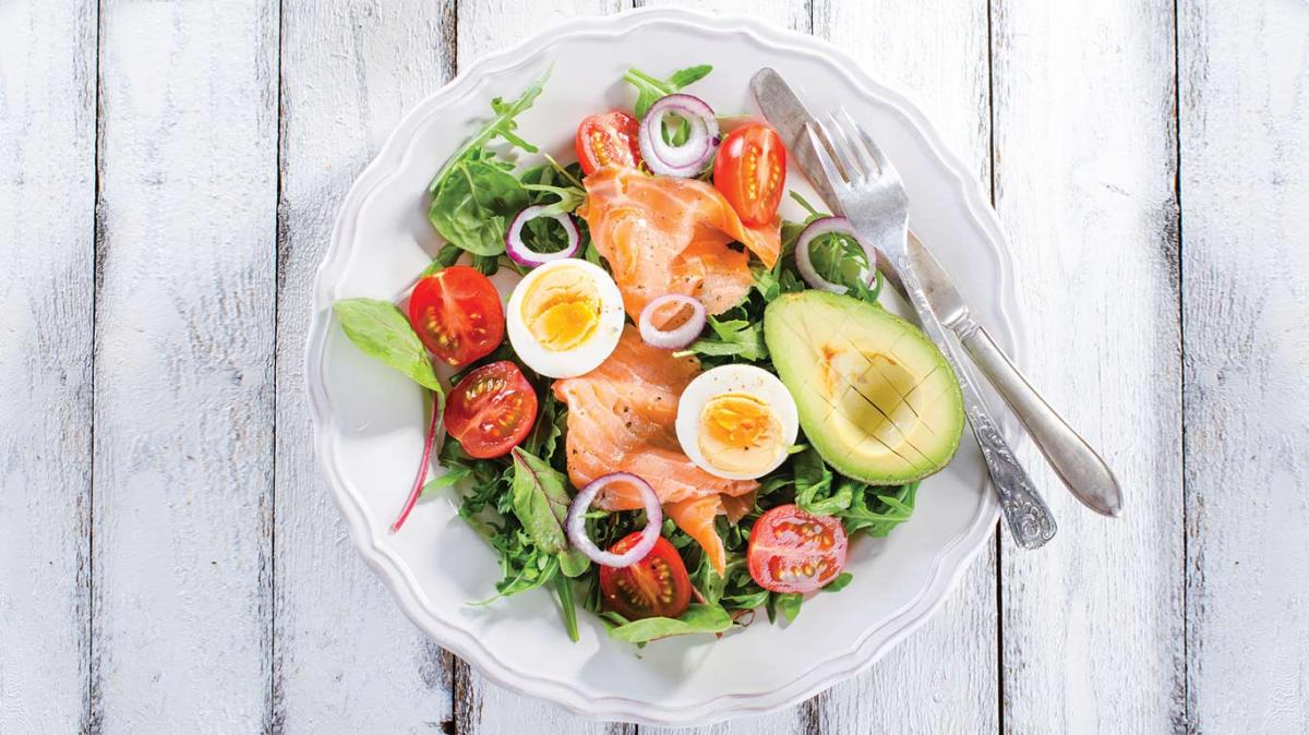 1accessibility.recipes.cookingstepЯйцата се сваряват за 8 минути. Изваждат се, потапят се в студена вода за 1 минута и след това се обелват.2accessibility.recipes.cookingstepАвокадото се разполовява, отстранява се костилката и вътрешността се напръсква с 1 с. л. сок от лайм. Нарязва се на кубчета.3accessibility.recipes.cookingstepРуколата и спанакът се измиват и подсушават. Чери доматите се режат на половина, а лукът – на тънки шайби.4accessibility.recipes.cookingstepСлагат се в подходящ съд. Налива се останалият сок от лайм и маслиново масло, подправя се със сол и черен пипер и всичко се разбърква добре.5accessibility.recipes.cookingstepСервира се в чиния като основа за авокадото, нарязаните на резени яйца и пушената сьомга.
