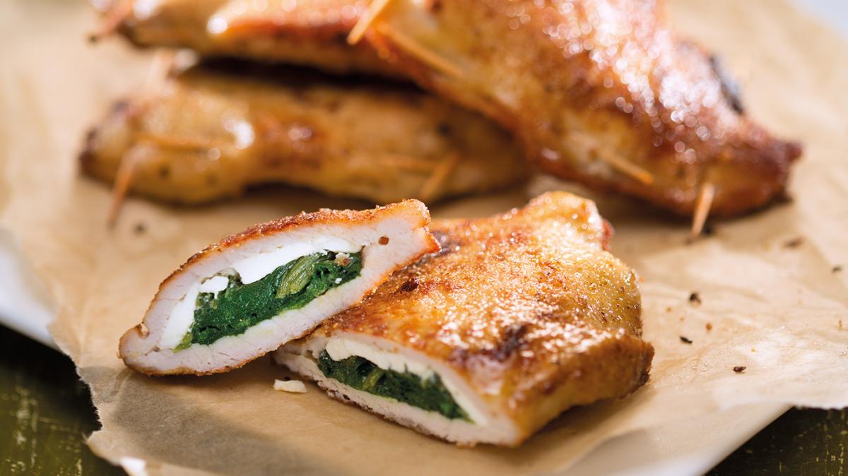 Върху половината от парчетата месо се поставя от спанака, следва сирене и се покрива с второ парче месо. От всички страни се затваря с клечки за зъби.