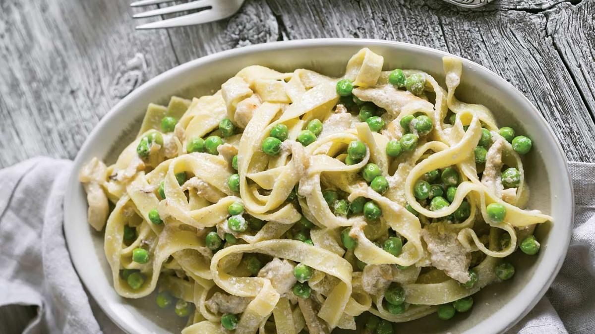 1accessibility.recipes.cookingstepПастата се сварява в подсолена вода.2accessibility.recipes.cookingstepЛукът се наситнява и се запържва до златисто в краве и маслиново масло.3accessibility.recipes.cookingstepДобавят се смачканият чесън и пилешкото филе, нарязано на кубчета. Разбърква се и се запържва за кратко.4accessibility.recipes.cookingstepСлагат се грахът, малко вода, индийско орехче, сол и черен пипер и се похлупва за 10 минути.5accessibility.recipes.cookingstepНаливат се виното и сметаната и се готви, докато се образува плътен сос.6accessibility.recipes.cookingstepНакрая се слага пастата, разбърква се и се поднася с настъргания пармезан.