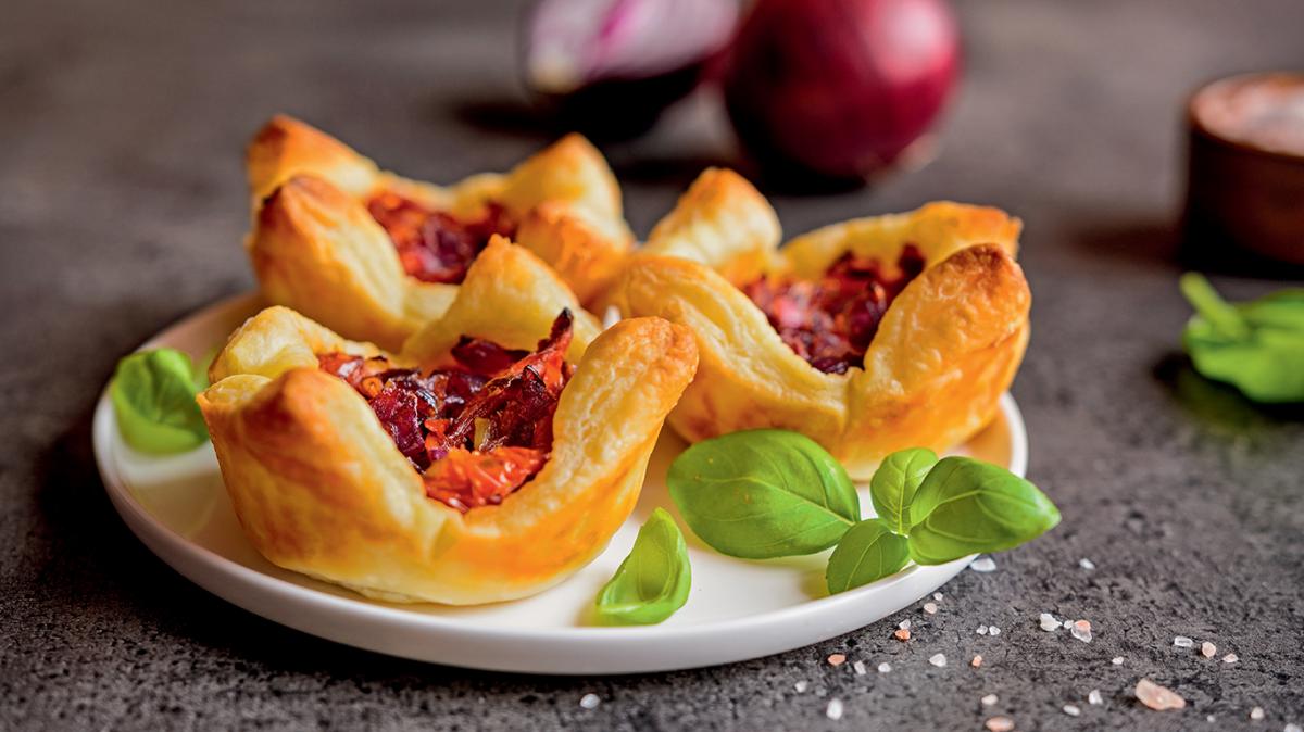 Бутертестото се разстила и от всеки лист се изрязват по шест квадратни парчета. Поставят се във форми за мъфини, надупчват се с вилица и в тях се разпределя плънката. Тарталетите се пекат в загрята на 200 °C фурна около 15 минути или докато придобият желания цвят. Декорират се с останалите листа пресен босилек и се сервират.