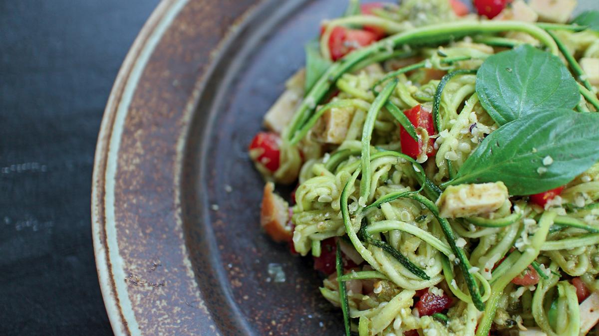 В кухненски робот се слагат орехите, босилекът, чесънът и маслиновото масло, и се всичко се смила до фина консистенция. Прибавят се солта, черният пипер и лимоновият сок и се разбърква. Нудълсите от тиквички се поливат с пестото.