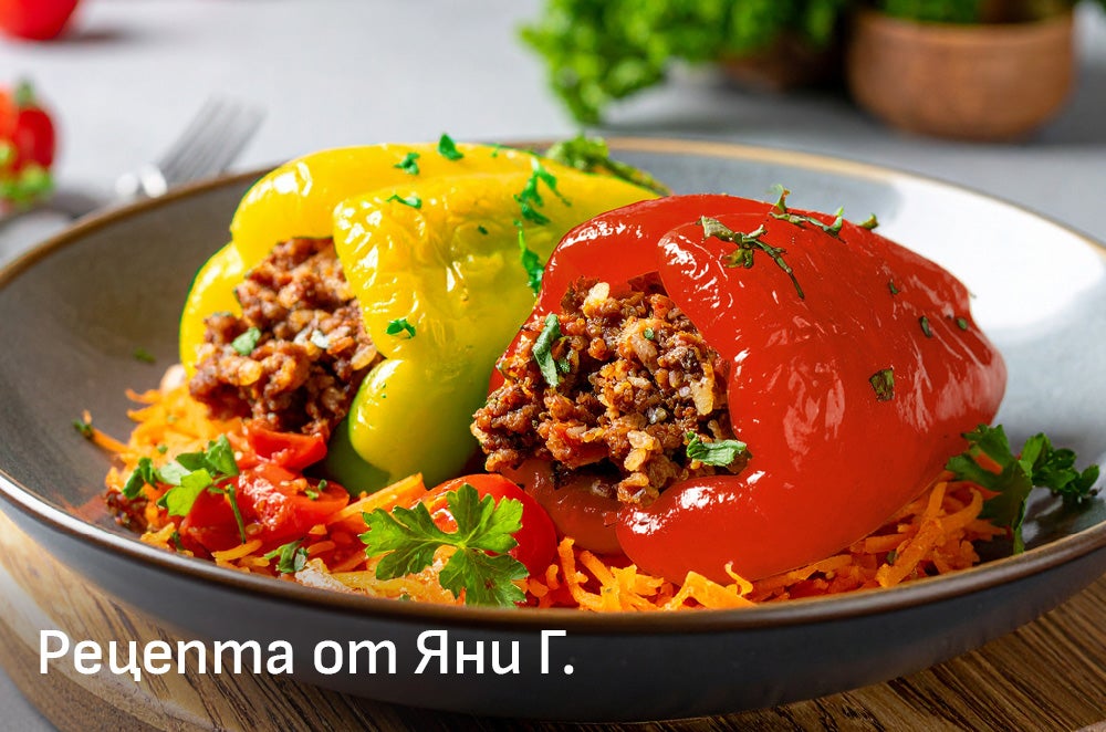 Пълнени чушки с кайма и ориз върху канапе от зеленчуци