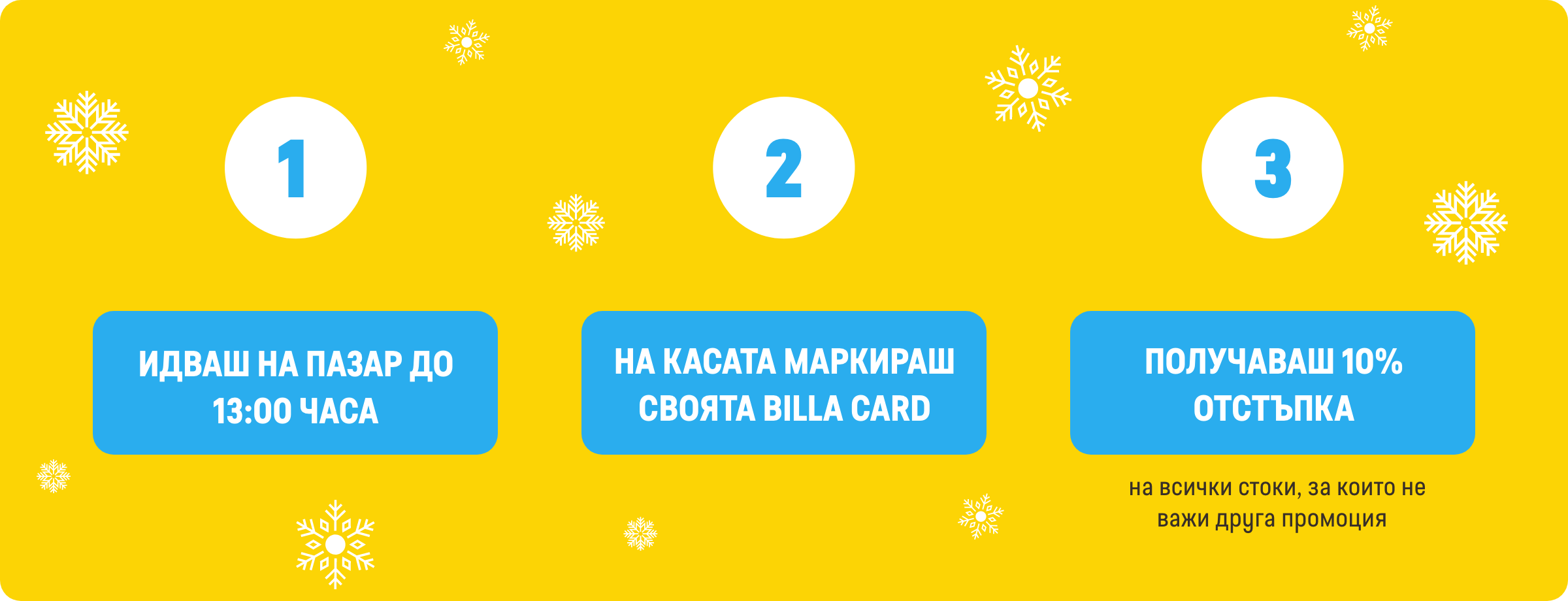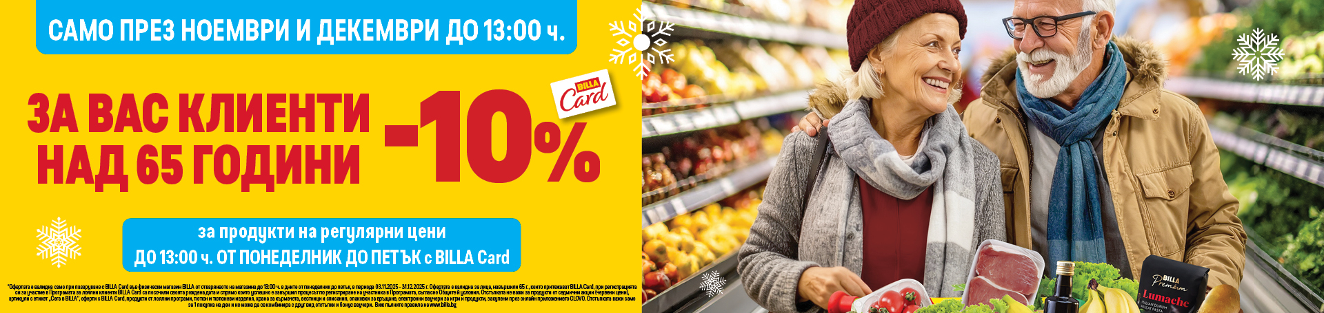 3.2. (изм. в сила от 03.11.2025г.) В часовия диапазон от отварянето на всеки физически магазин BILLA до 13:00ч. (българско време) в дните понеделник, вторник, сряда, четвъртък и петък, лицата, които имат право на участие в Кампанията съгласно условията на точка 3.1., при покупка във физически магазин BILLA с BILLA Card, получават отстъпка -10% от общата стойност на продуктите, закупени на регулярни цени.