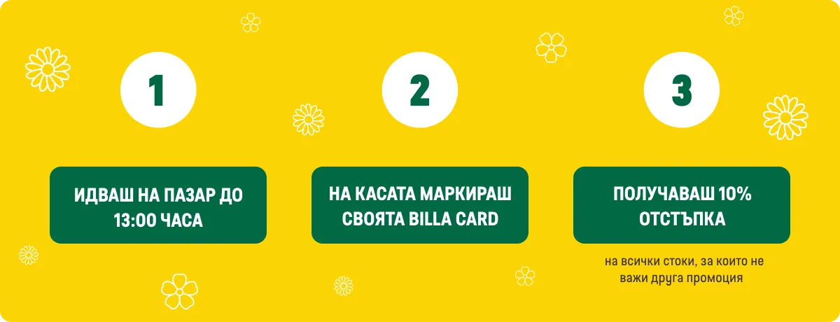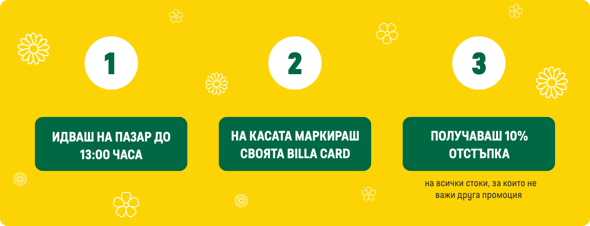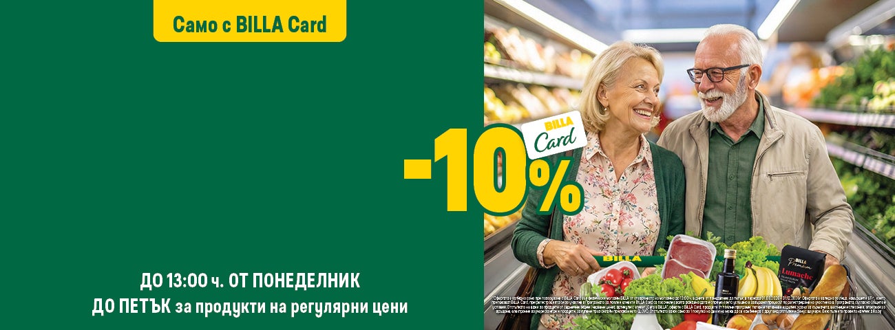 3.2. В часовия диапазон от отварянето на всеки физически магазин BILLA до 13:00ч. (българско време) в дните понеделник, вторник, сряда, четвъртък и петък, лицата, които имат право на участие в Кампанията съгласно условията на точка 3.1., при покупка във физически магазин BILLA с BILLA Card, получават отстъпка -10% от общата стойност на продуктите, закупени на регулярни цени.