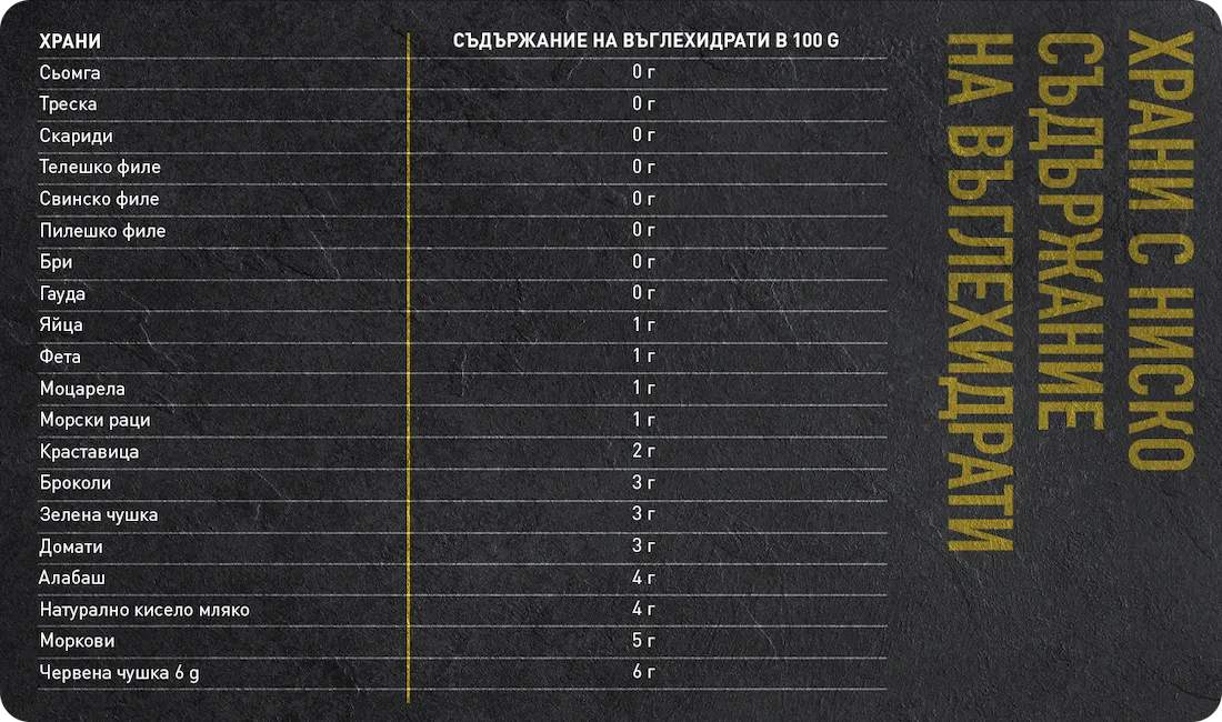 Много храни съдържат въглехидрати, но има и такива, които съдържат много малко или почти никакви въглехидрати. Към тях спадат например яйца, месо или риба, но също сирене и зеленчуци.